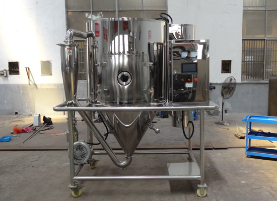 空氣經(jīng)過濾和加熱,進(jìn)入干燥器頂部空氣分配器,熱空氣呈螺旋狀均勻地進(jìn)入干燥室。料液經(jīng)塔體頂部的高速離心霧化器,(旋轉(zhuǎn))噴霧成極細(xì)微的霧狀液珠,與熱空氣并流接觸在極短的時間內(nèi)可干燥為成品。成品連續(xù)地由干燥塔底部和旋風(fēng)分離器中輸出,廢氣由風(fēng)機(jī)排空。